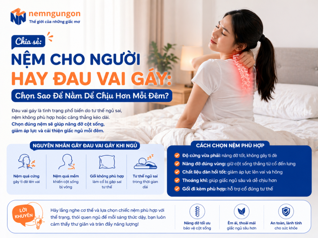 Đau vai gáy không phải lúc nào cũng do công việc hay tư thế ngồi. Một tấm nệm không phù hợp hoàn toàn có thể khiến cơ thể mỏi mệt hơn sau mỗi đêm. Chọn đúng nệm sẽ không phải phép màu chữa hết đau ngay, nhưng nó giúp cơ thể có điều kiện nghỉ ngơi đúng nghĩa và giảm bớt việc gồng sai suốt lúc ngủ.